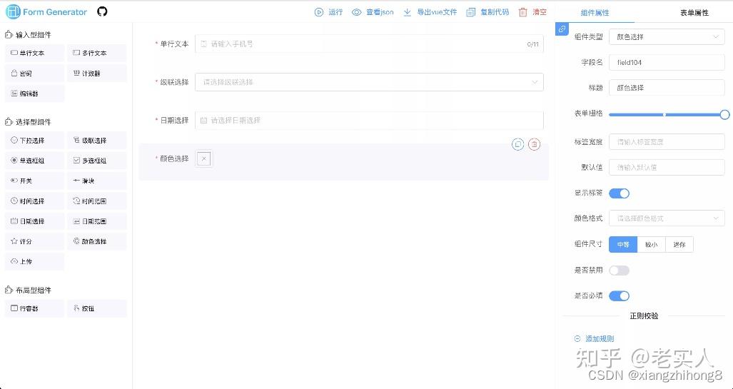 form-generator是一个基于Element UI表单设计及代码生成器,可将生成的代码直接运行在基于Element的vue项目中,也可导出JSON表单,使用配套的解析器将JSON解析成真实的表单。