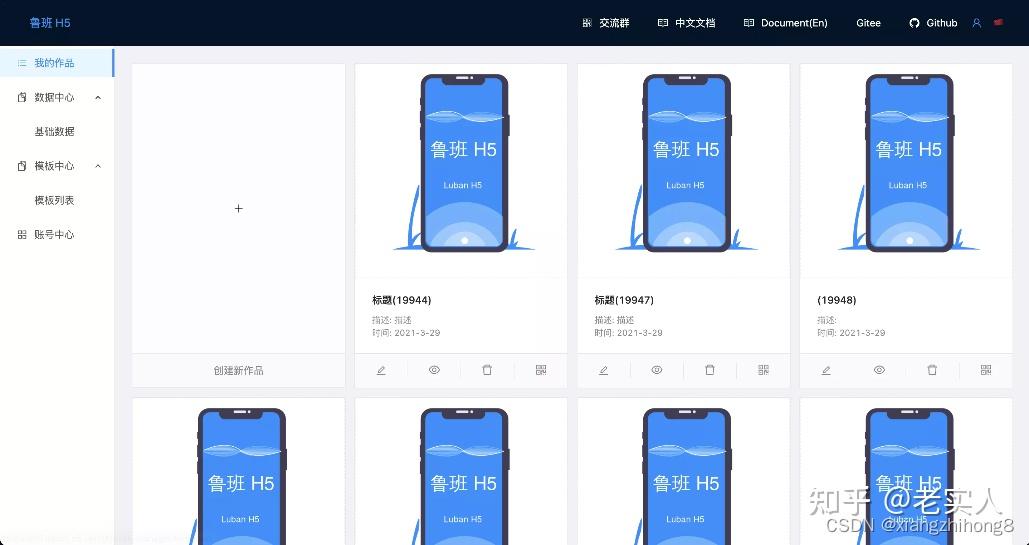 鲁班H5是基于Vue2.0开发的支持拖拽方式来快速生成页面的低代码平台,功能基本类似于易企秀、Maka、百度等H5平台。