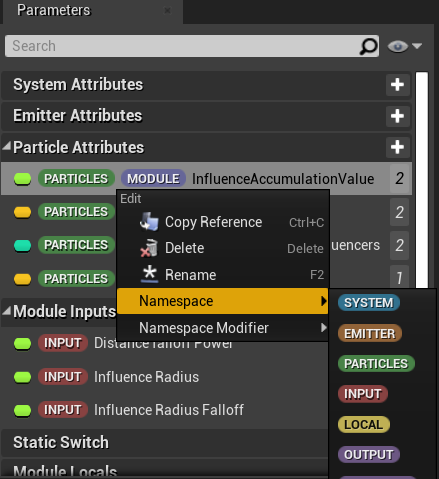 Niagara脚本编辑器的参数面板布局已得到更新,极大提高了Niagara脚本中所使用参数的清晰度。新布局与蓝图参数面板布局类似。参数不再按命名空间(系统、发射器、粒子等)分类,而是按描述其在脚本中用途的功能标签(输入、引用、输出和本地)来分类。新版本中,用户也可以用下拉菜单来选择参数的目标命名空间!
