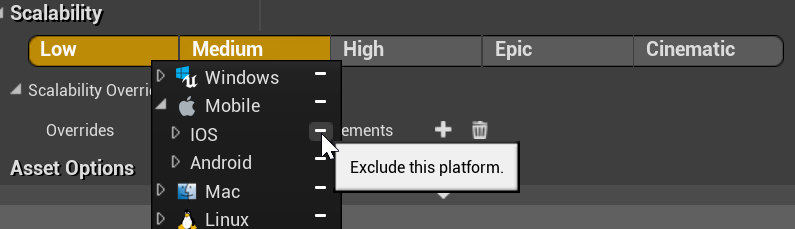 基于平台的伸缩性也能够在效果类型资产的伸缩性设置中进行指定。详情请见“Niagara效果类型资产”章节。