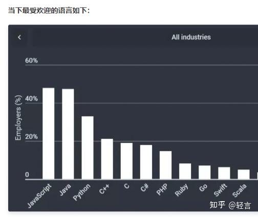 通过以上往年到今年的开发语言受欢迎程度发现,javascript这门前端必备的开发语言名列前茅,甚至在众多服务端开发语言中也不甘示弱,当然这之中并没有表明HTML CSS是一门开发语言,如果是的话,HTML CSS 也必将榜上有名,因为各行各业都不要网页对外公式自己的产品,但服务端开发语言五花八门,而前端必备javascript。