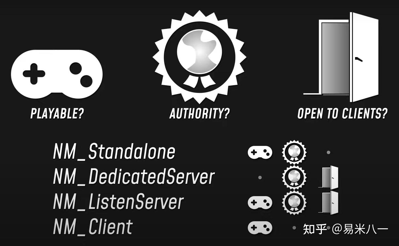 对于网络游戏,UE只支持客户端-服务器模型,服务器可以以两种不同的模式进行,分别是专属服务器(NM_DedicatedServer)聆听服务器(NM_ListenServer)