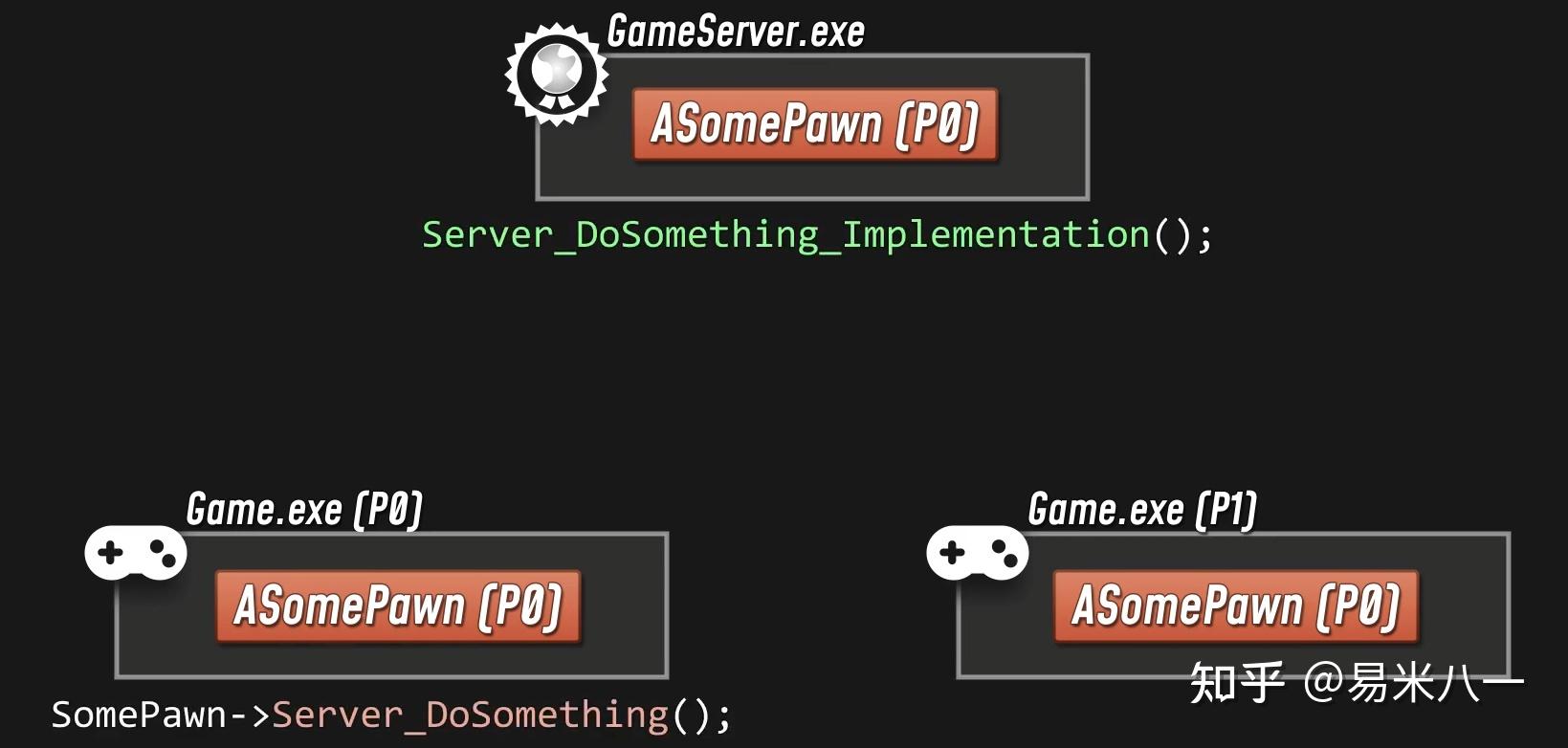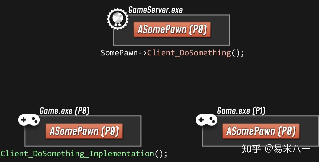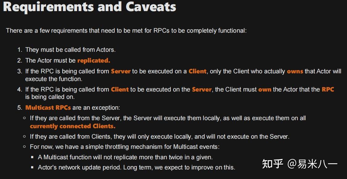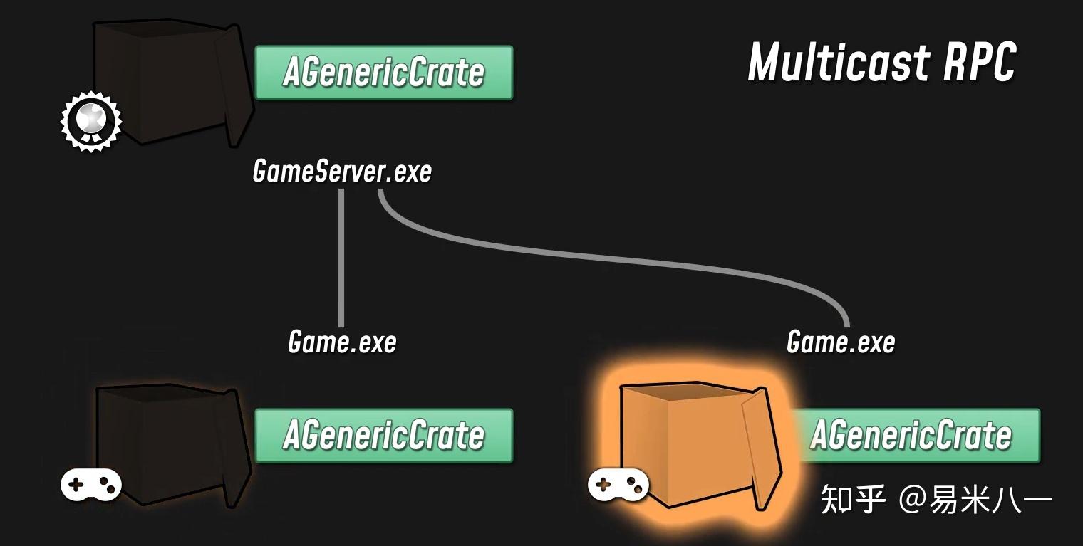 3. 最后是RemoteProceduralCall(远程过程调用),如果你将某个函数指定为多播RPC,那么当服务器调用这个函数时,服务器会发送消息到所有存在这个Actor副本的客户端,指示它们在自己Actor副本上调用这个函数。当然有多播RPC,也就有客户端RPC和服务端RPC。客户端RPC和服务端RPC让你能在服务端和真正拥有这个Actor的客户端之间单独进行消息通信。