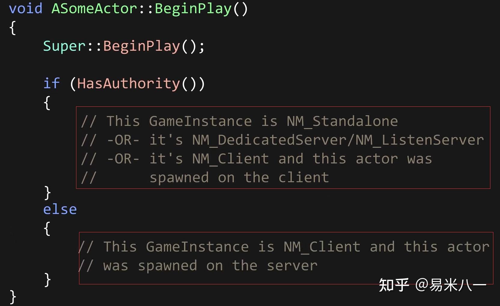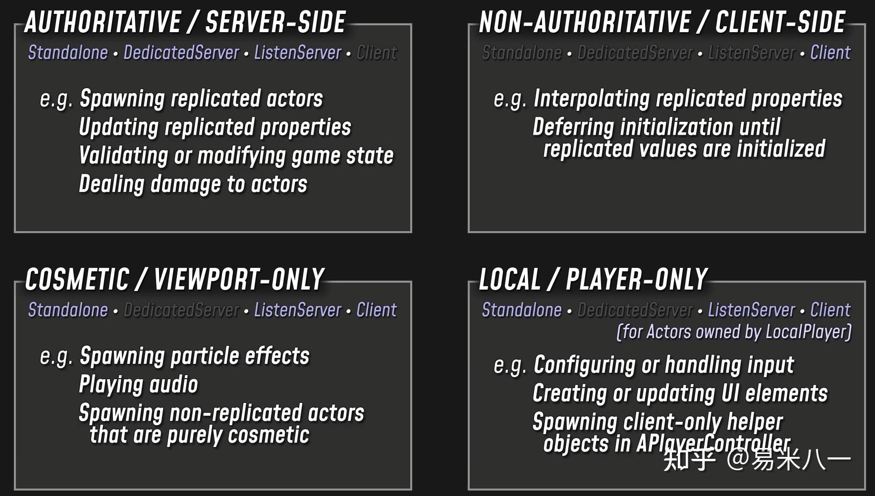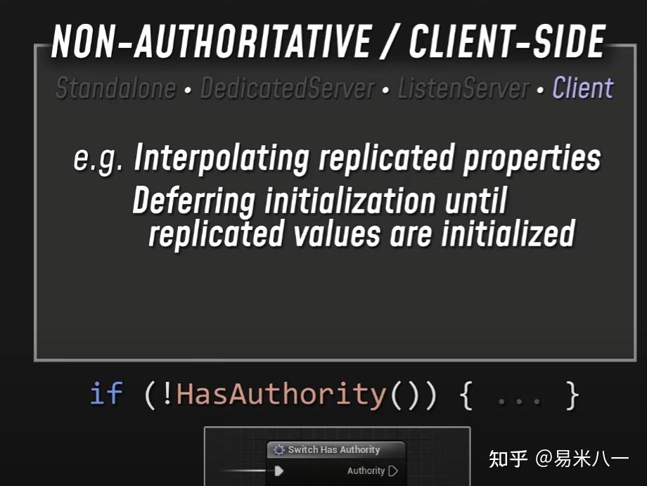 • 如果没有权威性说明当前的代码在客户端运行,且该Actor是从服务端复制过来的,此时,客户端的Actor副本是服务端上的权威版本的代理(Proxy)。