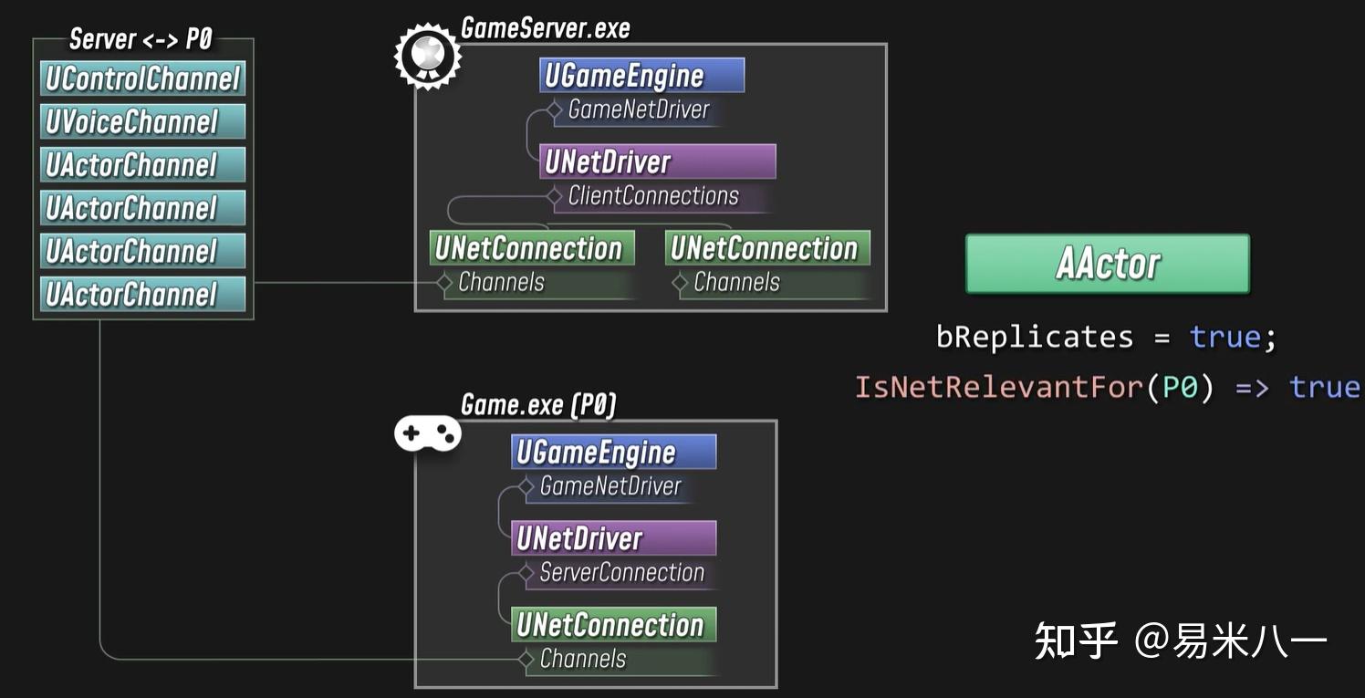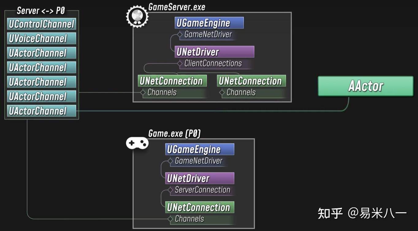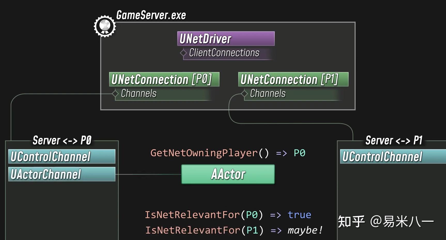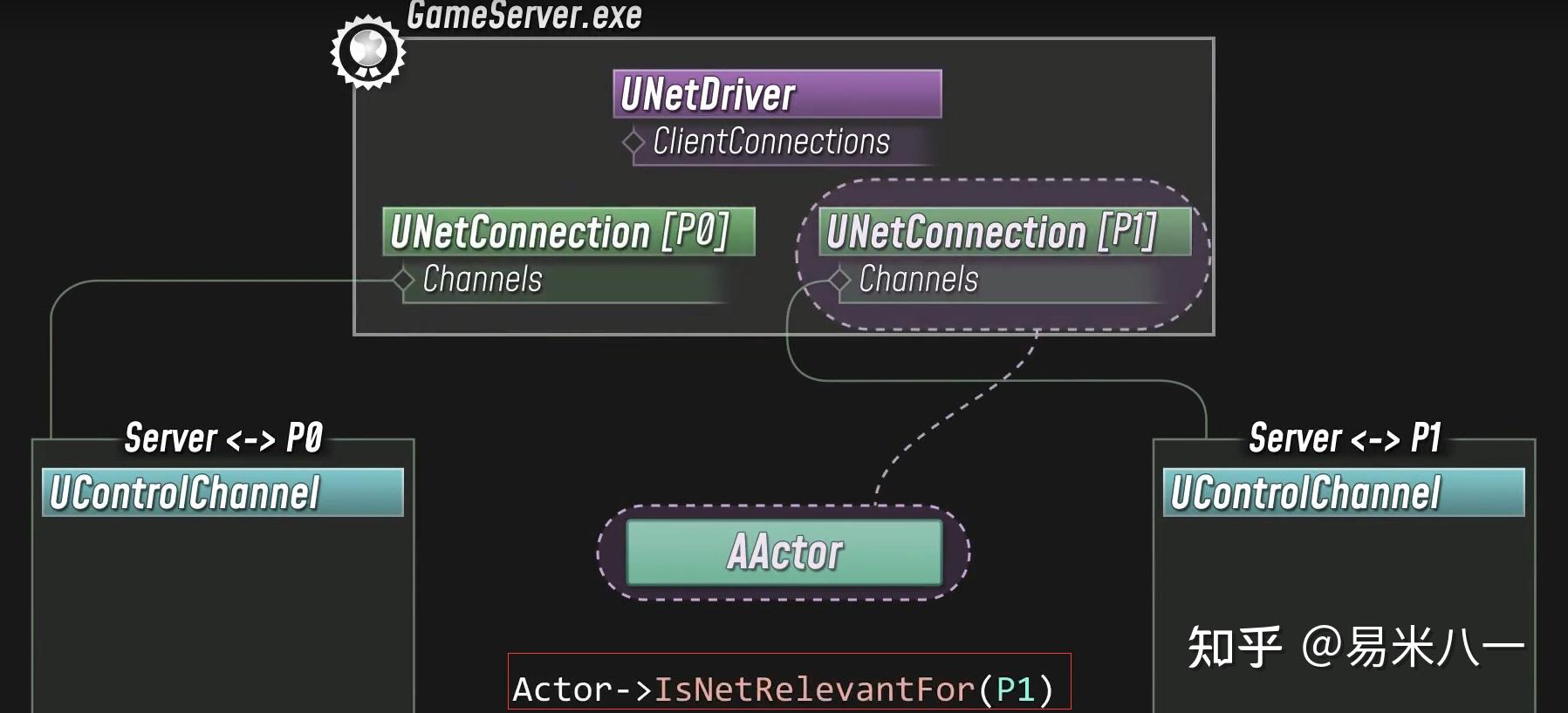 • 当一个Actor跟某个玩家相关时(相关性也是一个核心概念在下文介绍),那么服务器就会在对应这个玩家的UNetConnection中创建一个UActorChannel,然后服务器和客户端就会利用该UActorChannel来交换这个Actor的信息。(信息包装在哪里?)