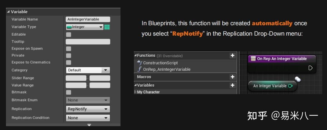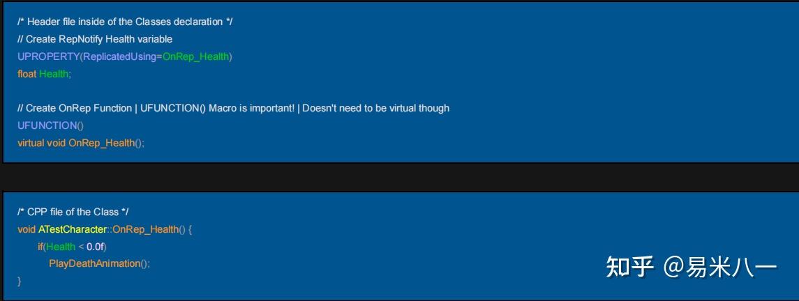 • 注意: 在蓝图中的RepNotify,当变量发生变化时,服务端和该值的客户端都可以调用指定的自定义函数。C++仅在客户端调用函数, 如果你想RepNotify逻辑在服务端和客户端上都运行,那么你需要在修改属性值之后手动在服务端调用RepNotify函数