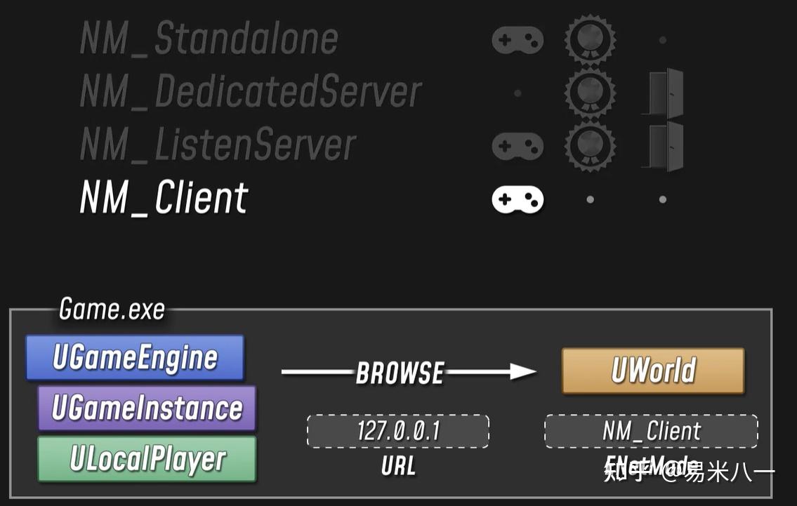 • 如果你的GameInstance已经连接到某个远程服务器,那么当前世界的NetMode是NM_Client。状态更新服从于服务器。