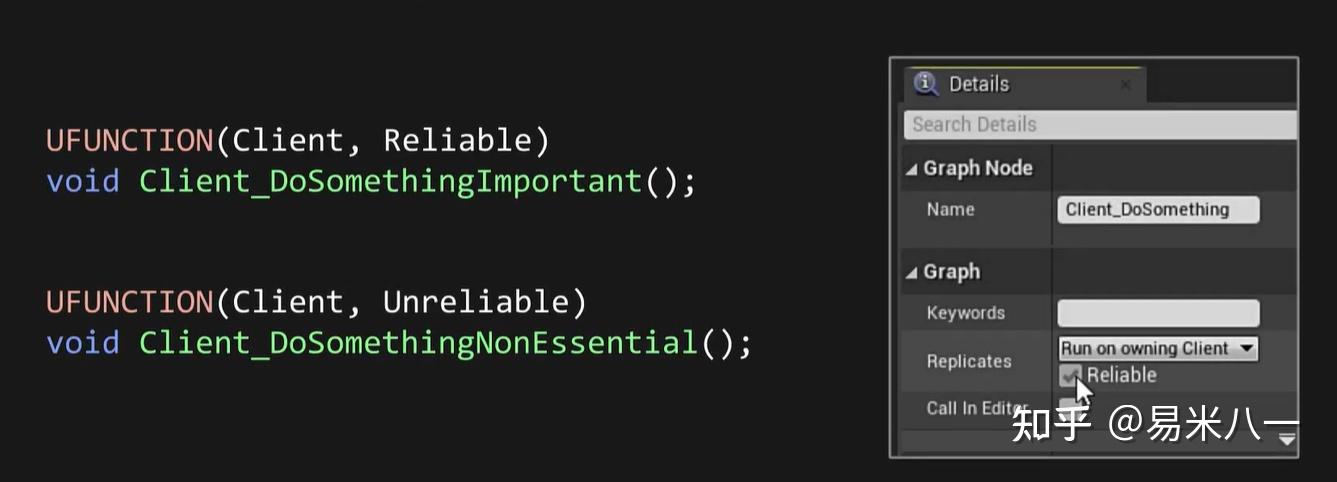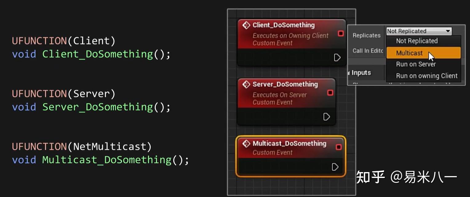 • 任何UFUNCTION都可以指定为Client,Server或者NetMulticast使得一个函数变成一个RPC。蓝图中通过设置函数的Replicates属性