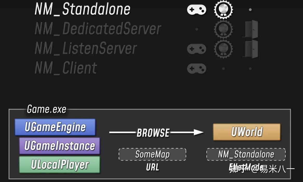 • 其是是UWorld的一个属性,UWorld代表的是一个地图或沙盒的顶级对象,Actor和Components将在其中存在并呈现。游戏实例可采用以下任意网络模式: