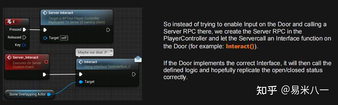 • 比如如果你直接在客户端调用Server_OpenDoor,而这个门Actor的所有权是服务器的,那么此调用会被丢弃,无法实现开门的同步。解决的方法是使用此客户实际拥有的Actor来调用服务器RPC,如下图,利用PlayerController结合接口来实现开门,PC是客户端拥有的Actor可以成功调用这个服务器RPC