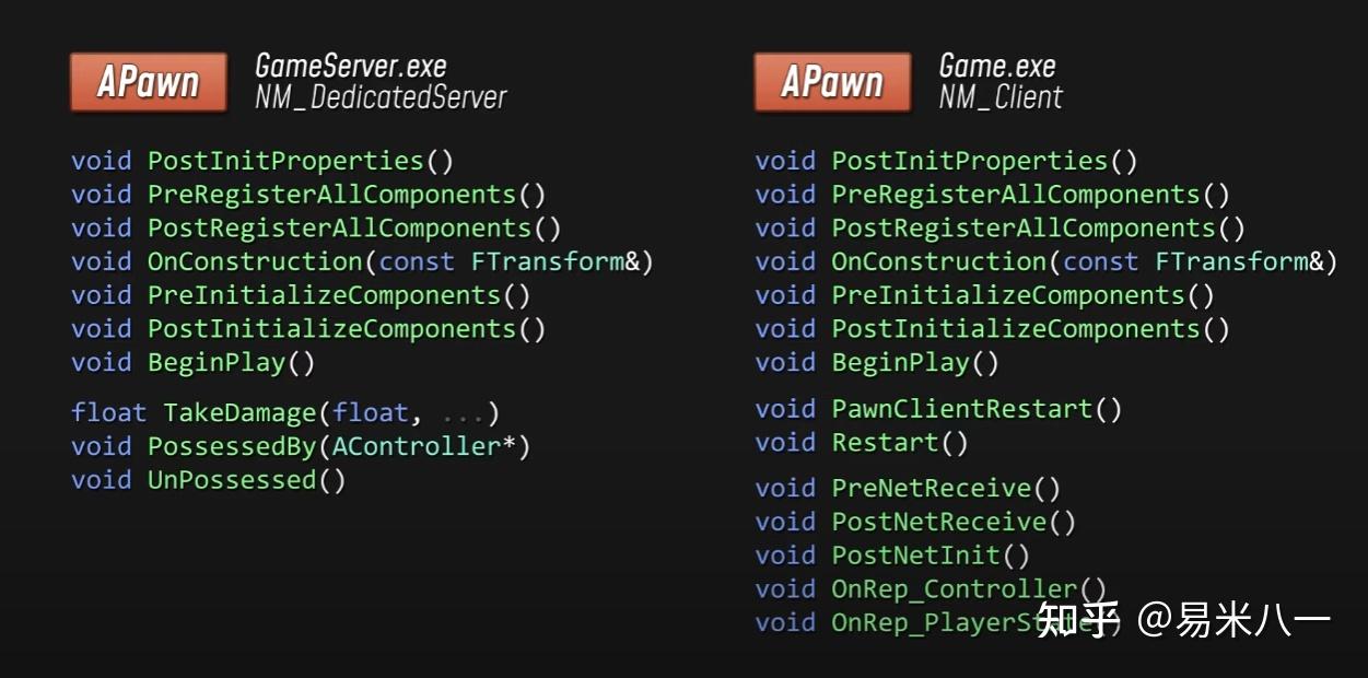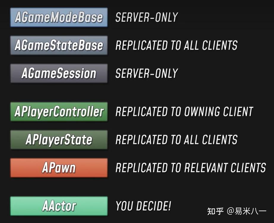 • 你的大多数代码最终都会基于UE的GameplayFramework进行构建。当添加你的功能时,需要注意这个函数是否只在服务端运行,或者只在客户端,还是在所有地方运行。