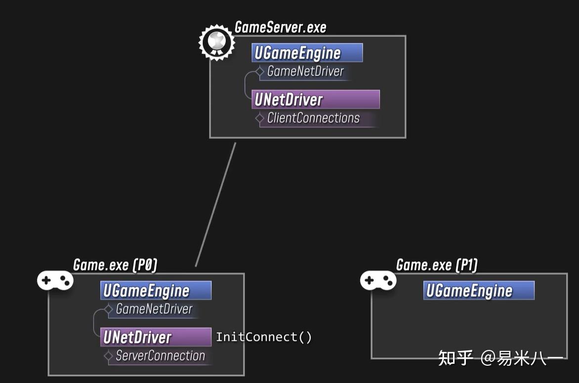 • 每个进程有一个UGameEngine对象,当服务器启动时,其会创建一个UNetDriver对象,其负责监听来自其它客户端的消息(InitListen)
