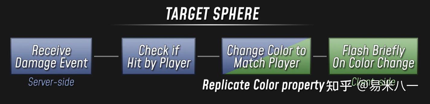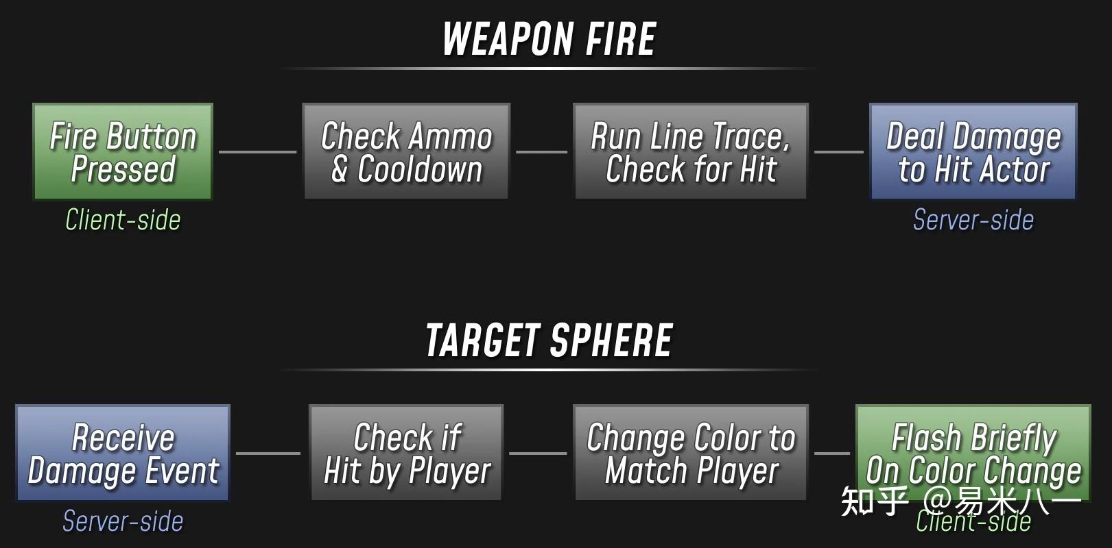 • 如果过程从服务器开始并且在客户端产生某种效果而结束,那么你需要考虑在哪里将数据复制到客户端。具有权威性的游戏状态更新代码会先在服务器运行(否则玩家可能因为访问并修改客户端数据而得到不公平的游戏体验),在此之后,只需要将小部分数据复制出去来重建最后的结果,并且让客户端独立处理剩下的步骤