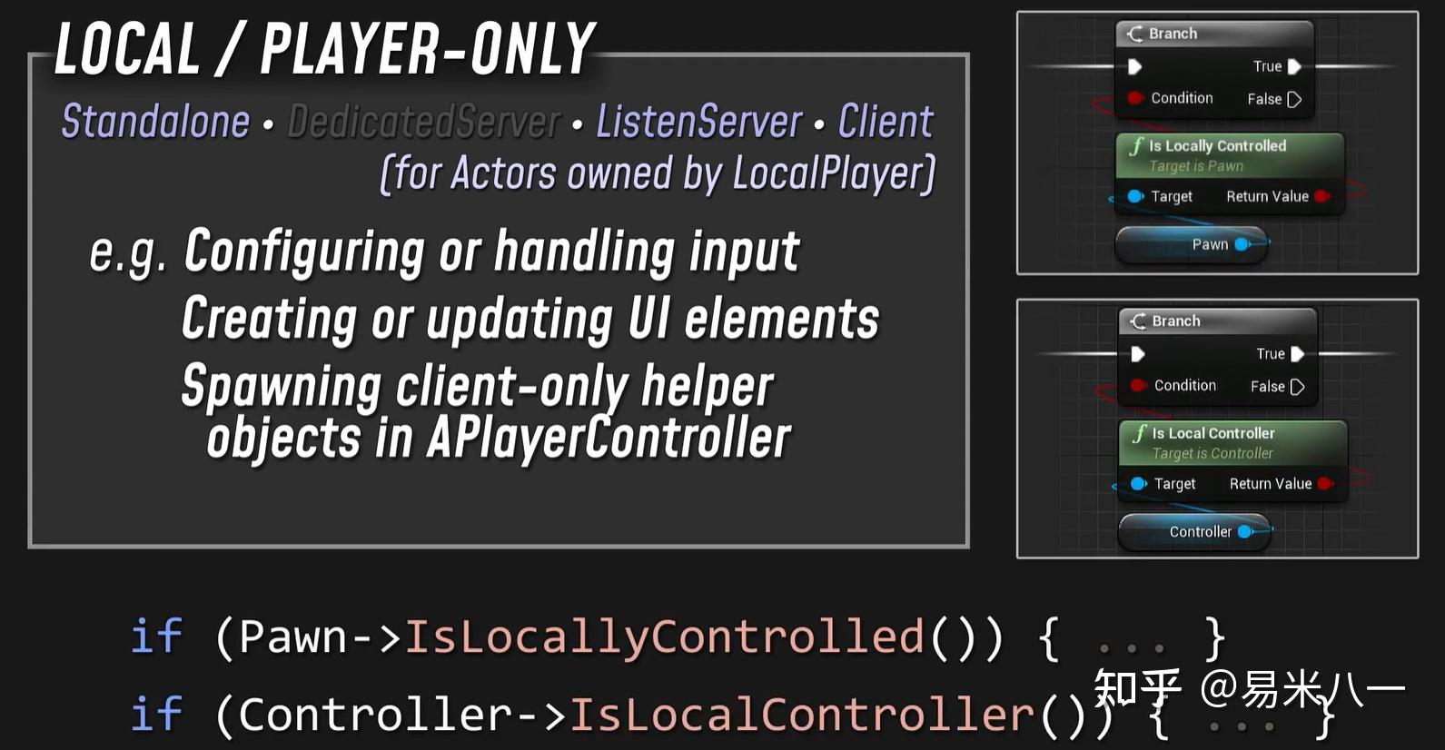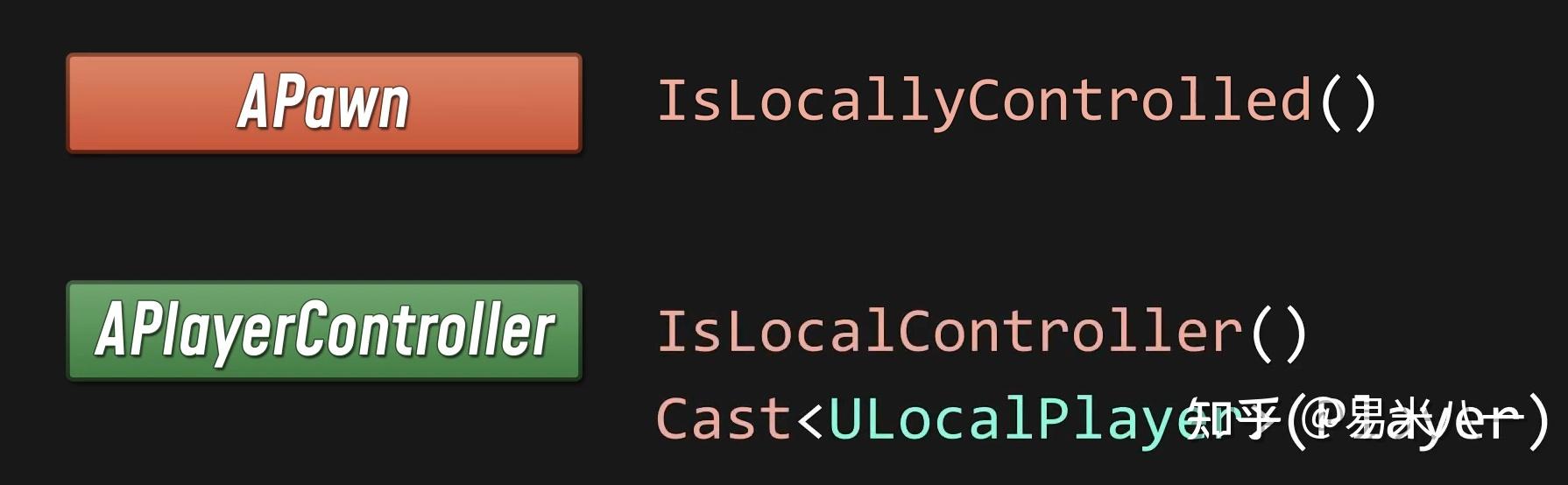 • 如果你在处理玩家角色相关代码,你就需要关注一个问题:当前玩家是否是本地控制的?否就代表是远程玩家。