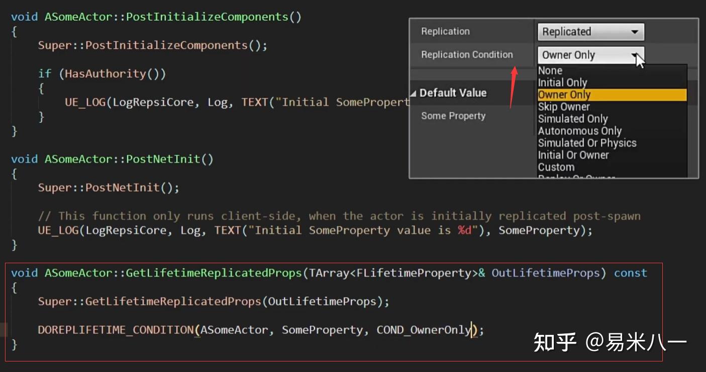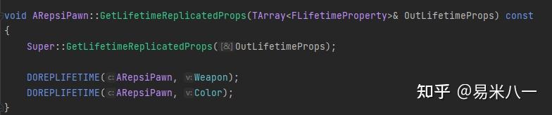 • 此函数指定哪些属性应该参与复制,以及在什么条件下可以复制的地方,最简单的是使用DOREPLIFETIME宏将某个属性一直复制到所有的客户端,但是你也可以使用条件复制。比如你可能只需要将属性复制给有拥有权的客户端