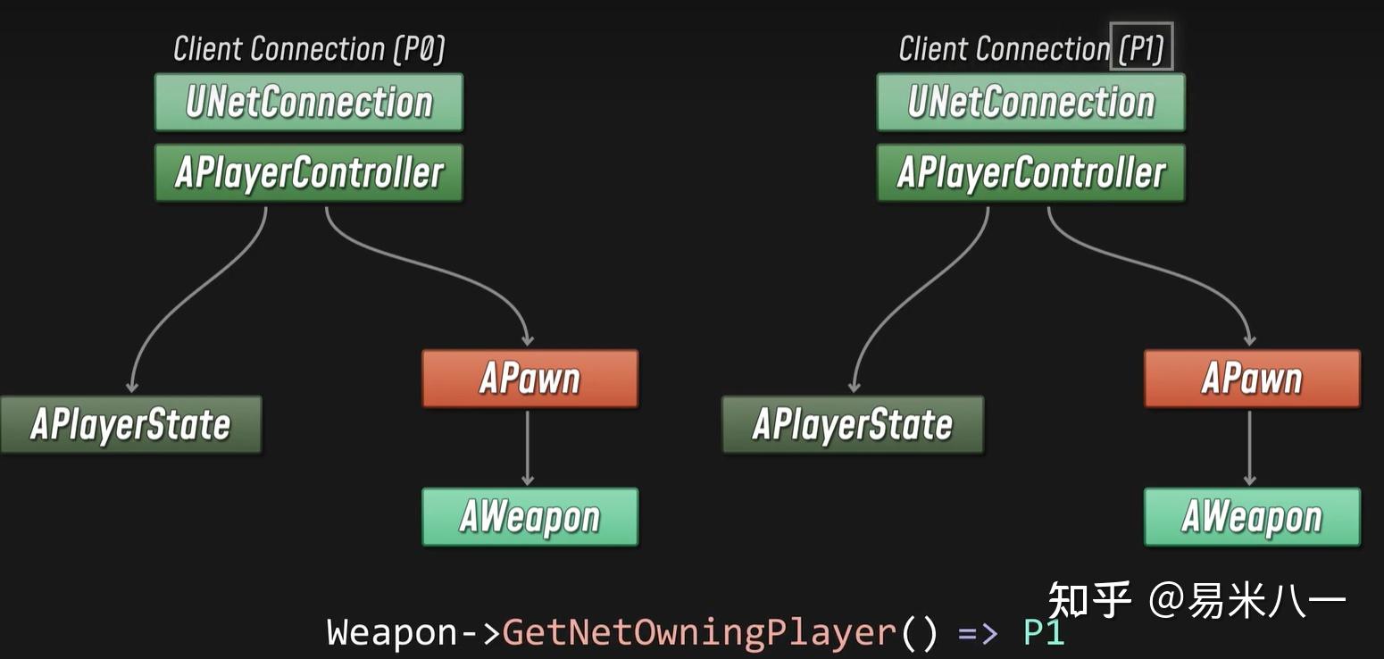 • APlayerController自动对它们所占有的Pawn对象具有拥有权。如果说每个APlayerController都有一个Pawn, 而每个Pawn都会生成并拥有一个Weapon对象。那么对某个Weapon对象沿着Owner引用链追溯到PlayerController,就能够知道这个Weapon对象属于哪个客户端。(这是所有权在网络复制中的作用之一)