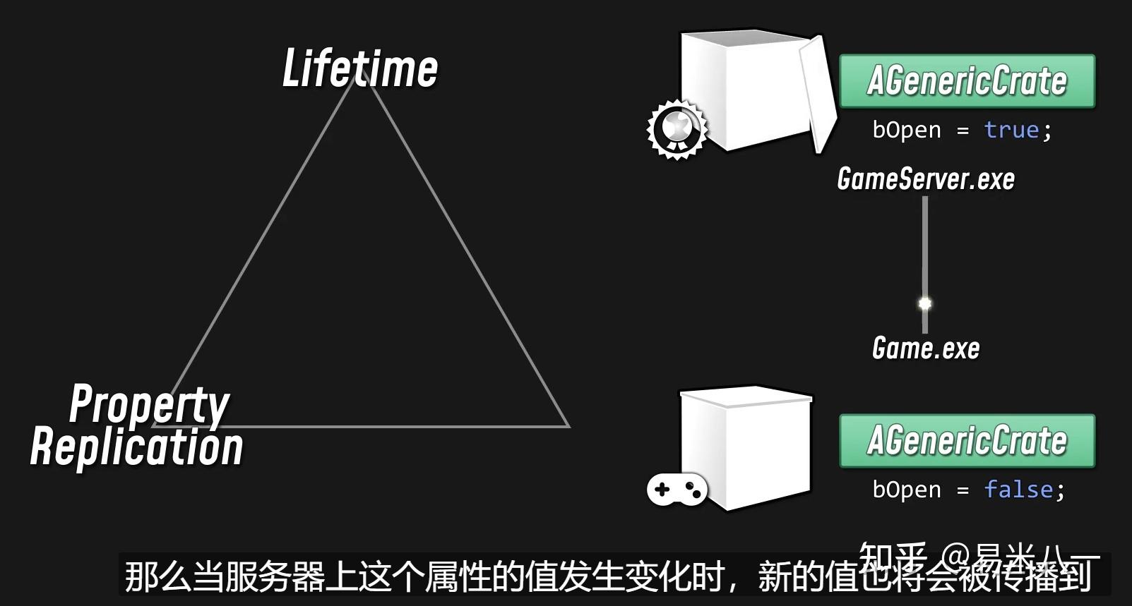 • 第二点就是属性复制(Property Replication)。上面提到的是整个Actor的生命周期的复制,那么每个Actor也有自身的属性,当服务器上Actor的某个属性值发生变化时,新的值也会被传播到客户端。这依赖于是Actor首先自身的bReplicates是true。