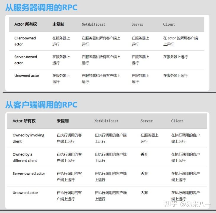 • 客户端RPC与服务器RPC相反,当服务器调用客户端RPC时,这个过程调用被发送给拥有所讨论的Actor的客户端。