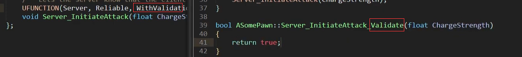 • 服务端的RPC也可以使用WithValidation说明符来实现一个验证函数,是一种检测作弊的手段,验证客户端发送给服务端的数据是否正常可靠。要注意一点如果服务器RPC验证失败,那么发送该RPC的客户就会被踢出游戏!