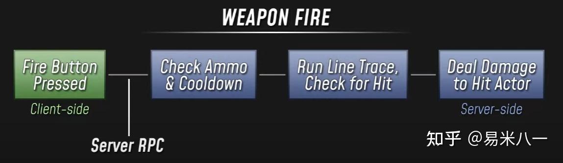 5. 把Actor中的功能想象成一组因果流程图,一些过程的开始与结束发生在网络的不同位置,这就是需要添加网络复制代码的地方。如下图武器开火的功能