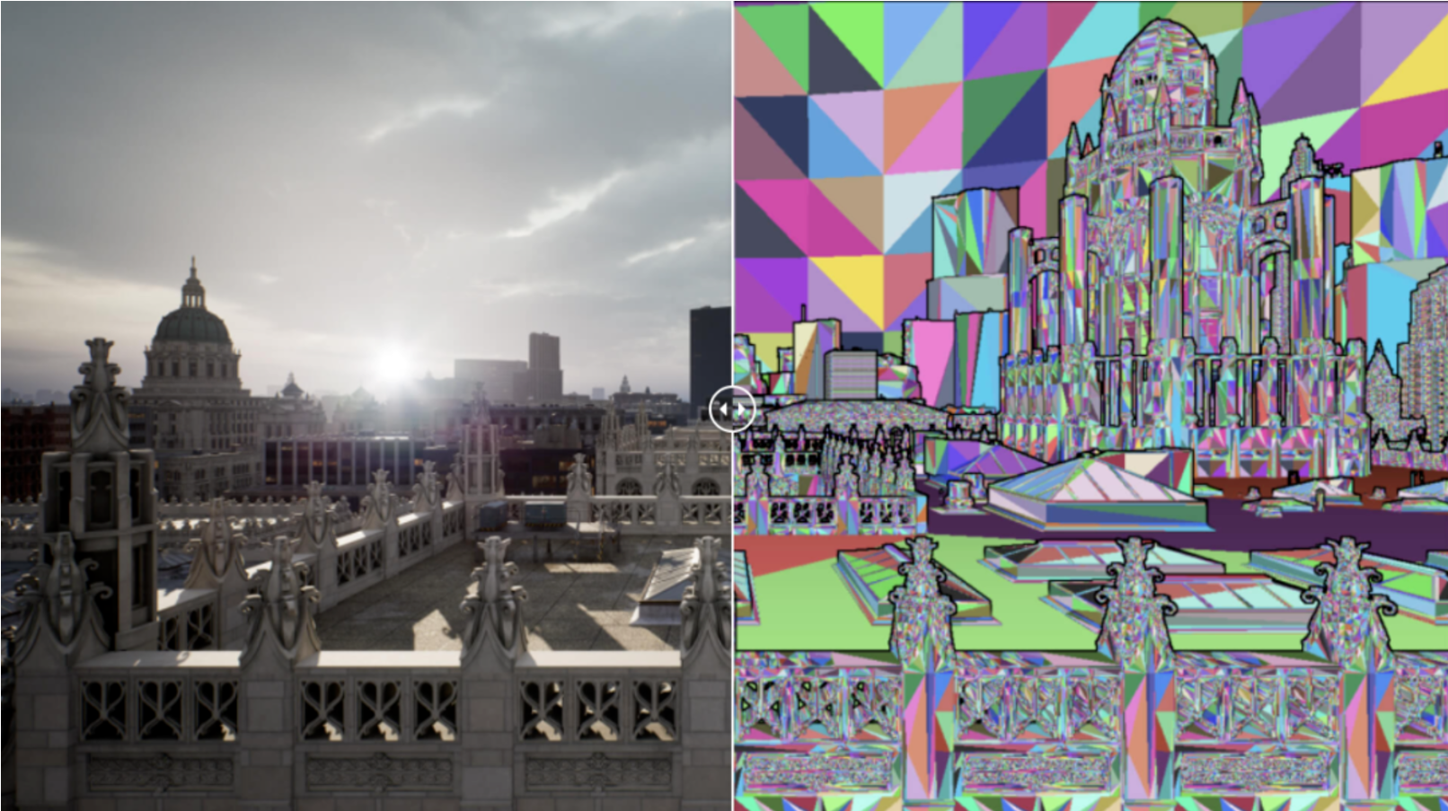 每一帧里的原始几何体三角面都超过十亿个,Nanite大致将他们压缩成两千万个无损三角面。Nanite几何图形实时进行流动传输和扩展,因此不会存在多边形的数量限制、存储限制或是绘制限制。同时在质量上也不会有折损。