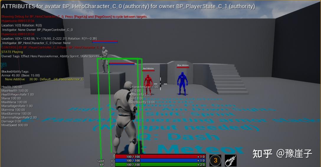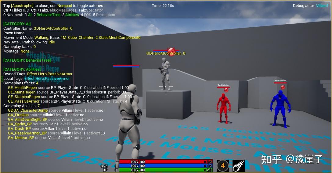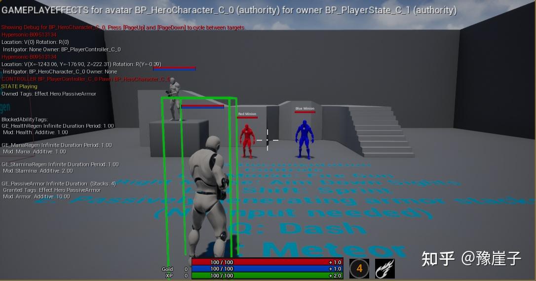 当你想要查看其他Character的GameplayTag, GameplayEffect和GameplayAbility时可以使用Gameplay Debugger, 可惜的是它不能显示Target的Attribute中的CurrentValue. 它会定位屏幕中央的任何Character, 你可以通过选择编辑器世界大纲(World Outliner)或者看向另一个不同的Character并再次按下反引号(`)键来修改Target. 当前监视的Character上方有最大的红色圆.