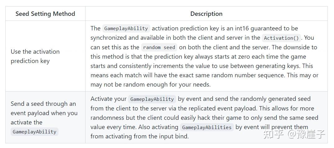 如果你的随机偏差很小, 大多数玩家是不会注意到每次游戏的随机序列都是相同的, 那么使用Activation Prediction Key作为随机种子就应该适用于你.如果你正在做一些更复杂的事, 需要防范破解者, 那么使用Server Initiated GameplayAbility会更好, 服务端可以创建Prediction Key或者生成随机数种子来通过Event Payload 发送.