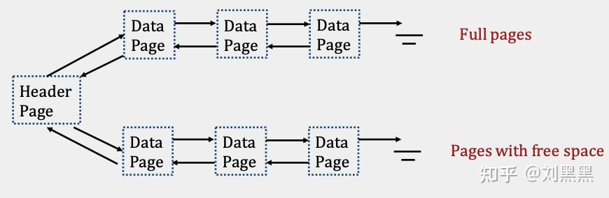 - When free data pages become full, they are moved from the free space portion to the front of the full pages portion of the linked list. We move it to the front, so we don't have to traverse the entire full pages portion to append it. An alternative is to keep a pointer to the end of this list in the header page.