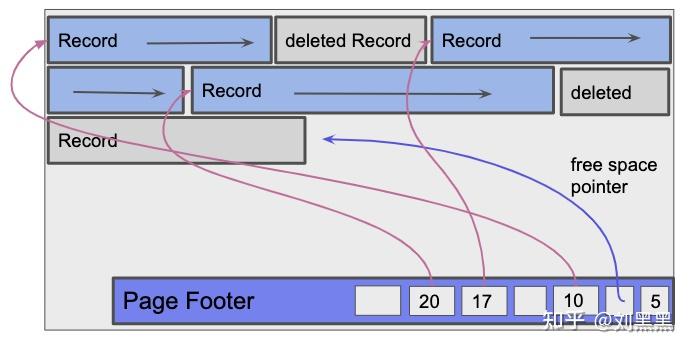 插槽目录包含插槽计数、可用空间指针和记录项指针,记录大小对.由于指针只是页面中的字节偏移量目录是 40 字节. 4(插槽计数)+4(可用空间)+(4(记录指针)+4= 40