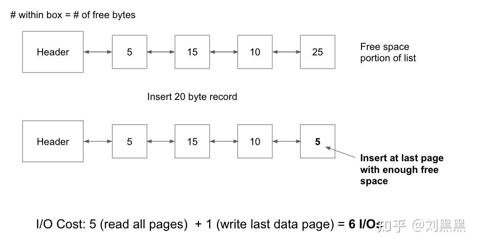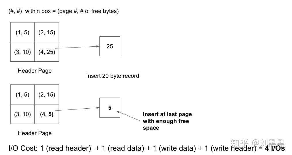 在最坏的情况下,只有最后一个标题页上才有足够的可用空间. 4(读取页眉页面)+1(读取数据)+1(写入数据)+1(写入最后一个页眉)=7 因此,成本为 7 个 I/O.