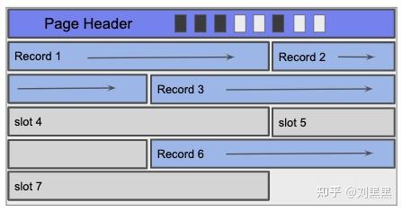 头指针通常会存储一个附加位图,该位图将页面拆分为多个插槽,记录插槽的状态(空闲 or 被占用).