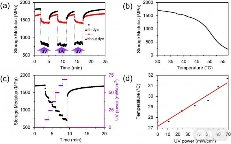 在这项研究中,科研人员应用具有光响应性的LCN材料作为动态涂层,可通过外部光刺激改变弹性特征,其高分辨率的局部自适应模量变化范围可达2微米。据悉,该材料可自适应功率强度50-90mW/cm²之间的紫外线,面对90mW/cm²功率的365纳米紫外线,弹性模量可降低87%。