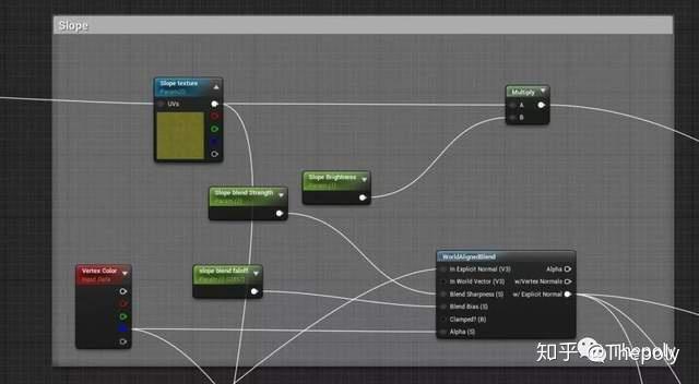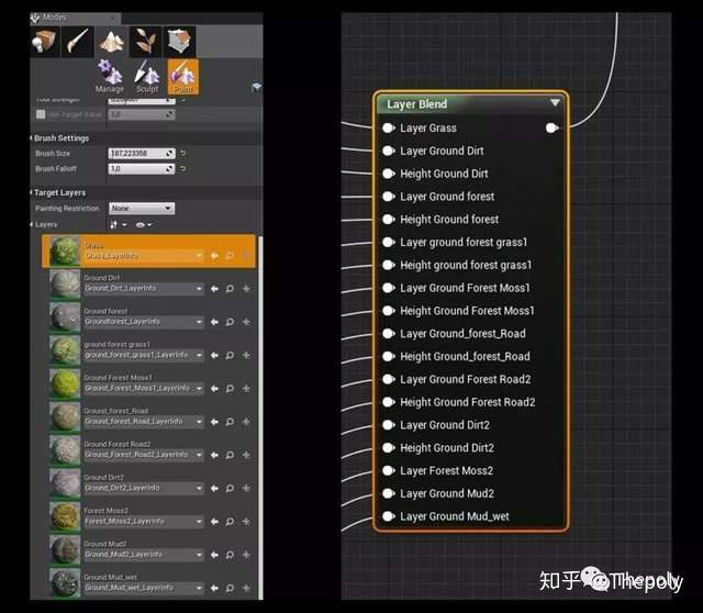 我下载了很多地表贴图素材然后在PS做了无缝处理,然后我在Crazy Bump中制作了对应的法线贴图以及高度贴图。landscape这块,使用了课程核心知识点,LandscapeLayerBlend 节点来制作多层地表材质。它允许我可以同时混合11张地表材质,同时在混合的时候因为我使用了高度贴图使最后的效果可以非常的自然!