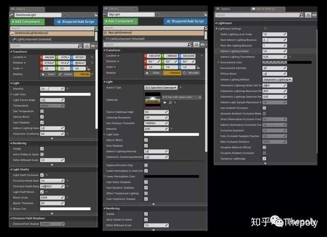 作为灯光的来源,我仅仅只用了一个平行光以及天光,Lightmass设置没有做改动。我保留了动态灯光而没有烘焙光照贴图。