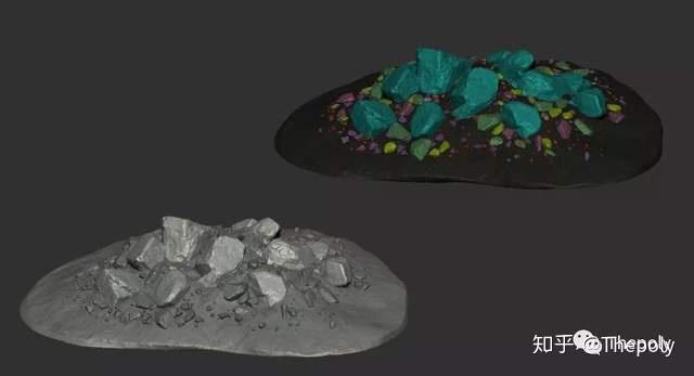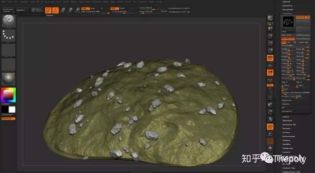 接着我要需要制作一个碎石堆,我减少了我石头的数量,在一个地面网格上使用zbrush的nanomesh功能吧碎石块散布在表面。