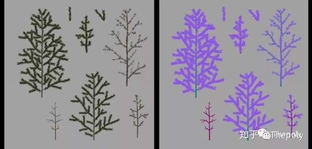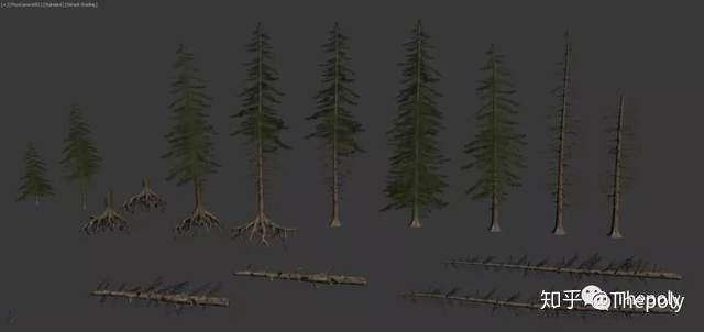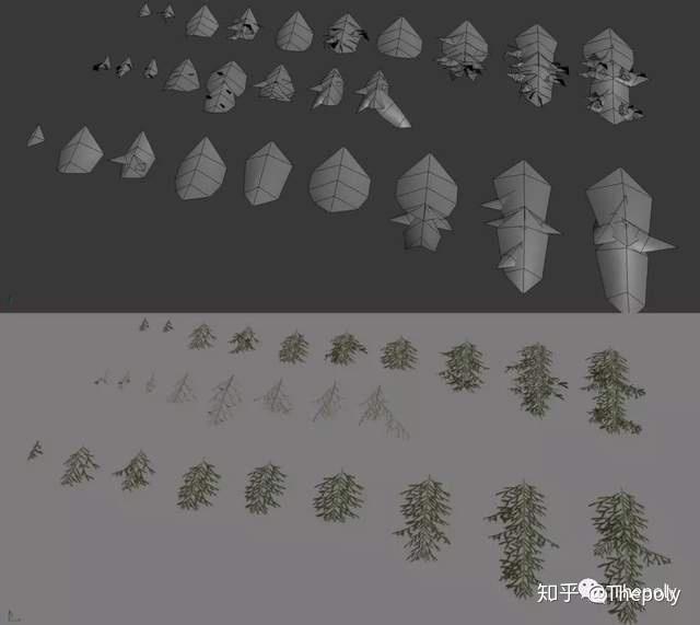 下一步,我准备开制作树木了。我做了很多枝叶然后跟树干排列在一起。同草堆制作过程一样,我做了很多版本(不同阶段)的树丰富造型。为了调整之后在引擎中枝叶摆动的效果,需要在排列的时候把顶点色绘制好,草也是一样的。