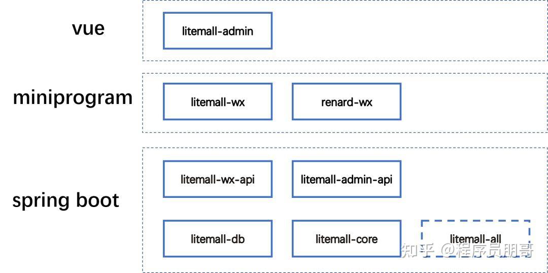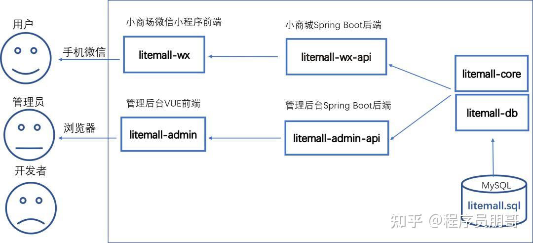 一个商城项目,包括 Spring Boot 后端 + Vue 管理员前端 + 微信小程序用户前端 + Vue 用户移动端。