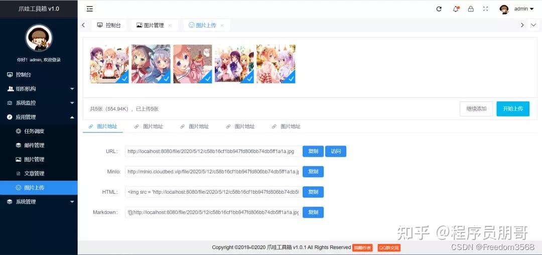 应用管理:任务调度、邮件管理、图片管理、文章管理、打卡任务、数据查询、人工智能,每个模块只需要你稍作修改就可以打造成一个项目了。