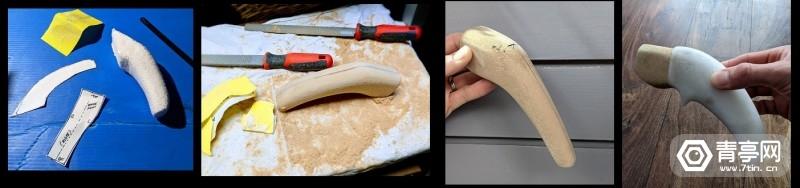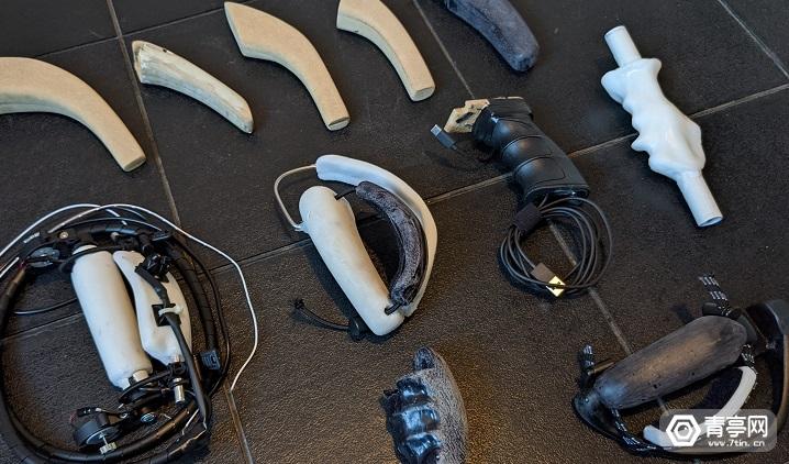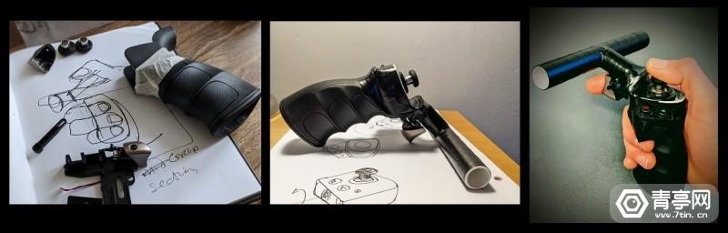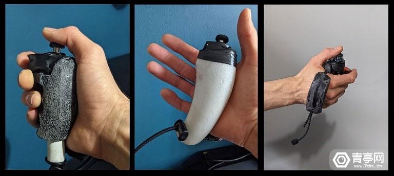除了Guncube外,还开发了各种不同类型的手柄模型,这些手柄的材质采用木头、热成型塑料,或是将二者结合。此外,还探索了各种不同形状、体积,比如直握柄、左右手不同的握柄、弯曲握柄、模块化握柄,还参考了Index手柄和Vive手柄的握柄设计。