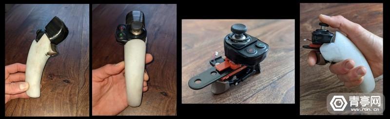 接着,Cole在这些VR手柄原型中加入Thrustmaster手柄上拆下的控制模块,比如A/B按钮、开关按钮、扳机。有趣的是,VR手柄的控制模块和摇杆面板上配备了可调节滑块,允许用户独立调整每个控制元件的相对距离。也就是说,在VR手柄上借鉴Thrustmaster灵活的模块化设计。