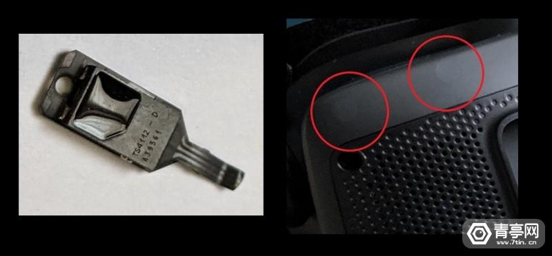 左边为Tundra HDK中的Triad TS4112光学传感器,其中反光的黑色区域为“传感器窗口”,负责接收SteamVR基站发射的激光定位信号。