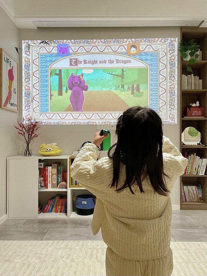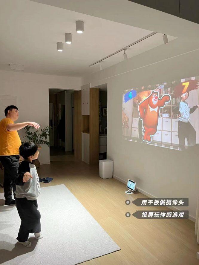 虽然AI运动APP在各个应用市场上都可以下载到手机中,但是实际体验起来,却似乎没有想象中那么愉快。手机放置地上容易倒,家长帮忙举着手又酸,而且由于使用时需要照到全身,所以孩子需要站远一点,但同时屏幕也更容易看不清。一些家长灵机一动,不如添置一台投影仪吧!屏幕够大,孩子沉浸感强,运动起来也更投入。