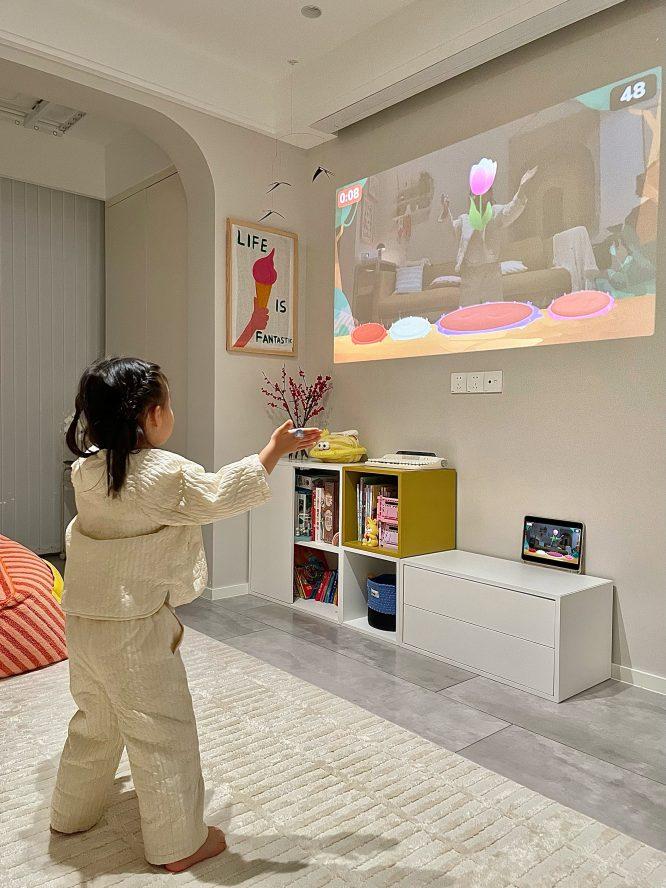 然而在选购投影仪时,也是有很多技巧的。比如有些投影仪对空间的要求高,需要3米以上的距离才能投出百吋画面,如果房间不够大,画面效果也随之大打折扣;还有的亮度太低,需要关灯才能看得清,孩子黑灯瞎火地活动,很容易绊倒、受伤;更有一些投影仪不支持侧投,孩子运动起来就会遮挡到画面,大大影响运动体验。