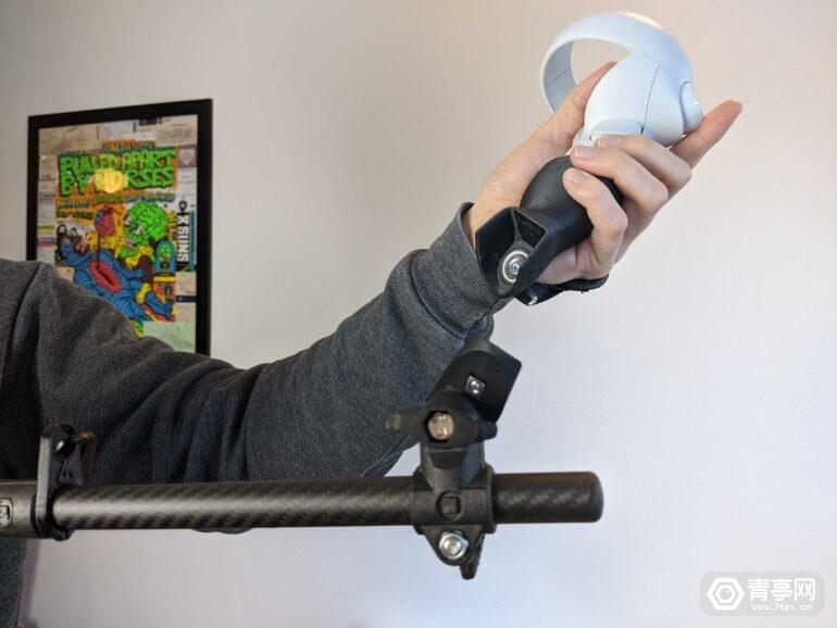 不过,Forcetube的设计还是有一些值得注意的方面,比如:磁吸式手柄套使用方便,你用单手就能快速取下手柄,从开枪切换成物品抓取、扔手榴弹等功能。而且,你还可以用带子将Forcetube跨在肩膀上(不过体验者表示这并不舒适),不用一直用双手托住。