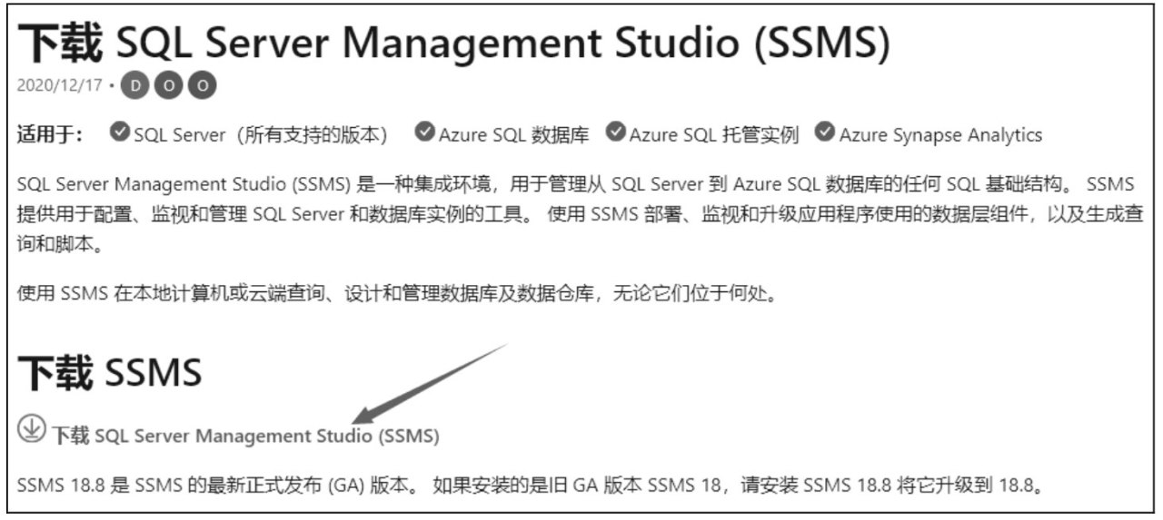(1)在浏览器中输入https://docs.microsoft.com/zh-cn/sql/ssms/,进入网页后,单击“下载SQL ServerManagement Studio (SSMS)”超链接,下载SQL Server Management Studio管理工具的安装文件