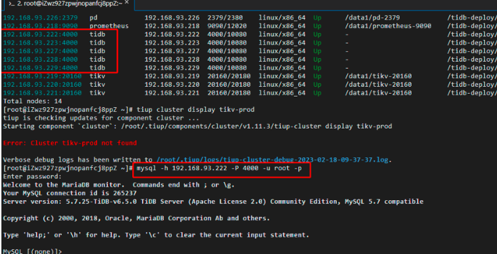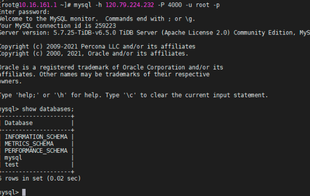 而我们根据集群的运行情况,我们就可以从详细信息中提取要可以连接数据库的关键信息,从而使用mysql客户端来直接连接我们的TiDB数据库: