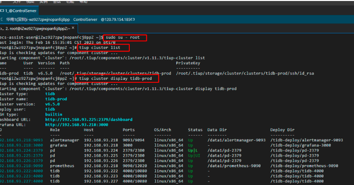 登录到ControlServer实例后,我们需要切换到root用户,然后就可以使用如下两条命令来查看我们的TiDB的集群的情况:
