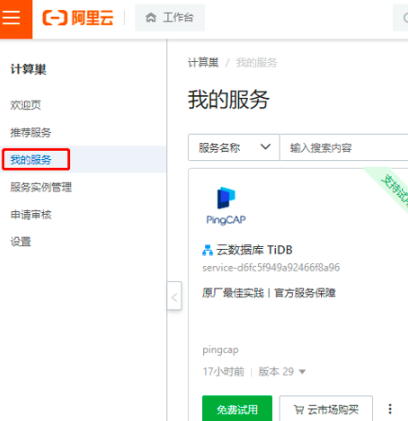 1、第一步,点击菜单“我的服务”,会在右侧看到我们已申请有试用权限的“云数据库TiDB”服务,而后在右侧的服务中点击“免费试用”: