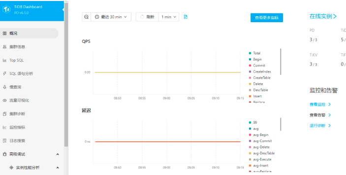 3、其中在基本信息框中包含了两大监控工作,一个是其自研的“TiDBDashboard“,其看板中展示了我们所有DBA都关心的各大关键维度的监控信息,同时对数据库实时的SQL进行了多个维度的分析: