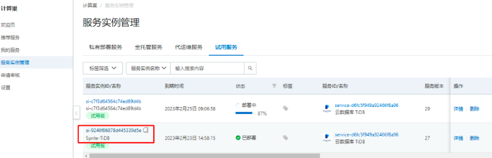 待服务部署状态已转变成“已部署”时,我们就可以按照指引来正常使用我们的云数据库TiDB了。